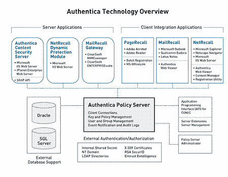 支援高度安全256-Bit RSA RC4 的加密方法 以及 MD5 的訊息完整性演算法 以及 五種不同的認證機制,以確保“數位資產”儲存與傳遞發行時的真正安全性 任何使用者與 Authentica Policy Server之間的資訊傳遞皆經過 3-DES 的 SSL 安全加密通道,避免有心人士的竊聽,同時也完全透通於防火牆,避免防火牆設定的調整與增加開放 Port 的風險,自動產生與管理加密金鑰,建構一個對於使用者與管理者皆“高透通性”且“低管理負擔”的安全機制